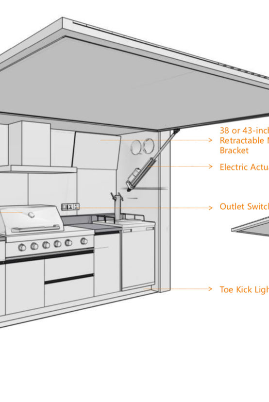 The Standard Pod is ideal for medium-sized gardens, offering a perfect balance of style and functionality. It features a premium BBQ Grill, a Stainless Steel Sink with a pull out faucet, a widened backsplash for extra storage. With integrated lighting, an electric lift up door and a TV creates the ultimate outdoor cooking and entertainment space.